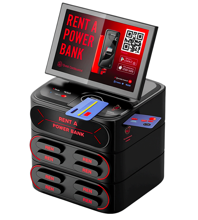 estación inteligente de carga modular con 8 slots para power banks, diseñada para proporcionar energía portátil de forma simultánea a varios usuarios. Incluye funcionalidades de seguridad, conectividad remota y soporta múltiples métodos de pago. Ideal para espacios públicos como aeropuertos, centros comerciales, restaurantes o eventos.